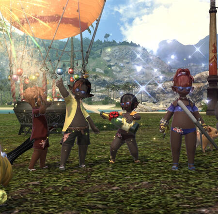 Backstory: Coco, Mango, Sassy and Tangerine are errand hunters in train. They left their tribal Lalafell tribe to travel around the world, looking for places for their tribe to move in. They like creating chaos wherever they go, stealing, taking odd jobs as mercenaries and anything needed. They enjoy living in the wild, and come and go as a group. Coco is known amongst her friends because she's the youngest daughter of a family of pig farmers. She earned her place in the tribe, proving to be as skilled as any of the male hunters. She always travels around with a little pig her mom sends her to raise... But they always end eating it.